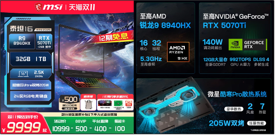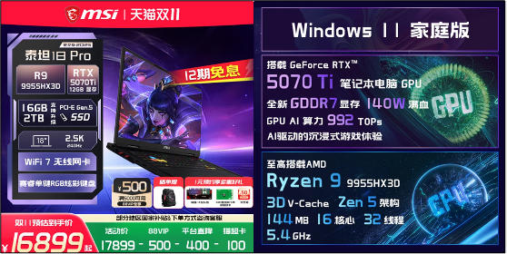 微星泰坦16 AI不仅是旗舰性价比的爆款,也是RTX5080/5070Ti高端显卡首发护航的爆款。凭借旗舰的性能、丰富的配置、以及超高的性价比,一经推出就颇受好评。结合年底双11大促,此前还没下手的玩家真心不容错过。