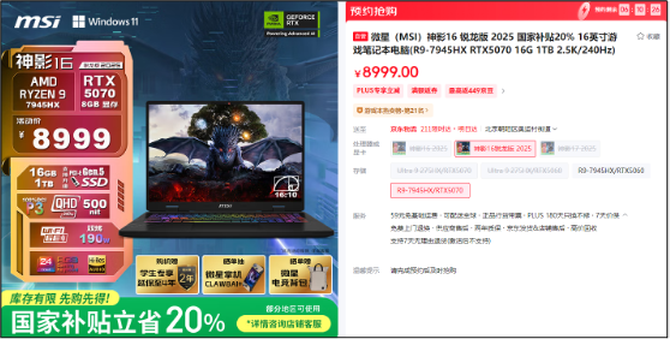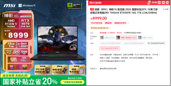 特别值得关注的是,部分地区享受"国补"优惠政策,购买微星电竞本最高可节省20%的购机费用。即使不在国补覆盖区域的消费者,也能享受平台提供的多种优惠券和补贴活动,整体优惠力度依然可观。