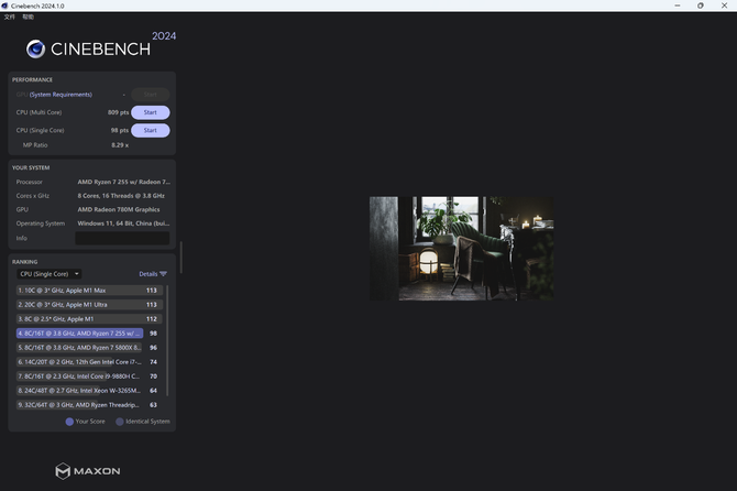 而在更新的Cinebench 2024测试中,其单核成绩为 131pxs,多核成绩为 1079pxs,该成绩在同价位轻薄本中处于中上游水平,进一步印证了 AMD 锐龙 7 H 255 处理器在 “办公级负载” 下的稳定输出能力。