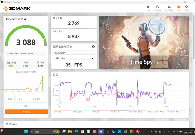 在显卡性能测试中,依托 Radeon 780M 核显,3DMark Time Spy项目实测得分 3088 分,该项目主要针对中端显卡性能,此成绩足以流畅运行轻度图形处理软件,如 Adobe Photoshop 修图、Lightroom 照片调色等,处理图片时加载素材、应用滤镜均无明显卡顿。