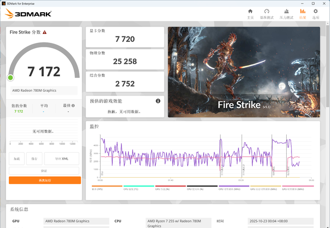 在对图形性能要求更高的Fire Strike项目中,得分达7172分,即便应对轻度3D建模或简单视频剪辑,也能满足基础需求。