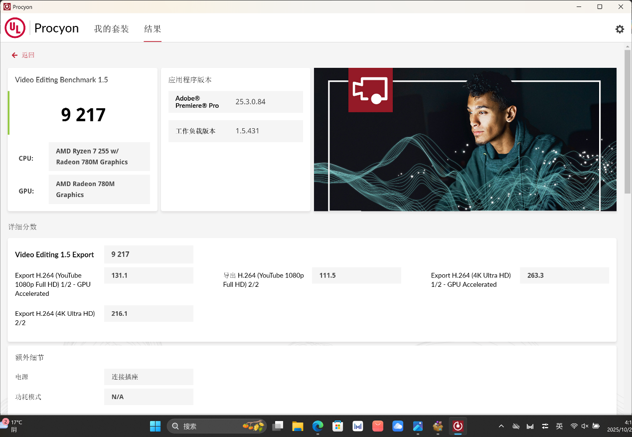 在Procyon视频剪辑渲染测试中,得分达9217分,虽然这款机型定位办公本,但该成绩表明其能应对轻度视频剪辑需求——例如用 Adobe Premiere Pro或者剪映剪辑简单视频,加载素材、时间线预览、导出1080P分辨率视频时,均能保持稳定速度,无需长时间等待。