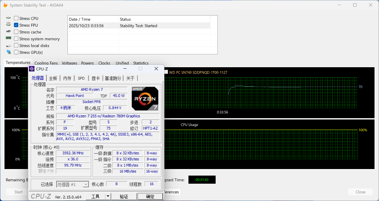 Hi MateBook 14 锐龙版采用双风扇散热模组,为检验散热系统的实际效果,我们采用AIDA64软件进行CPU单烤机测试,测试环境为室温25℃。在持续烤机30分钟后,温度最终稳定在70℃ ,期间未出现明显温度波动,从机身触感来看,键盘区域仅轻微发热,掌托位置无明显热感,完全不影响正常输入操作。这一表现说明,Hi MateBook 14锐龙版的散热能有效压制AMD锐龙 7 H 255处理器的热量,即便长时间进行数据处理、视频剪辑等高负载办公任务,也能保持机身凉爽与性能稳定,避免因过热导致的“降频卡顿”问题。