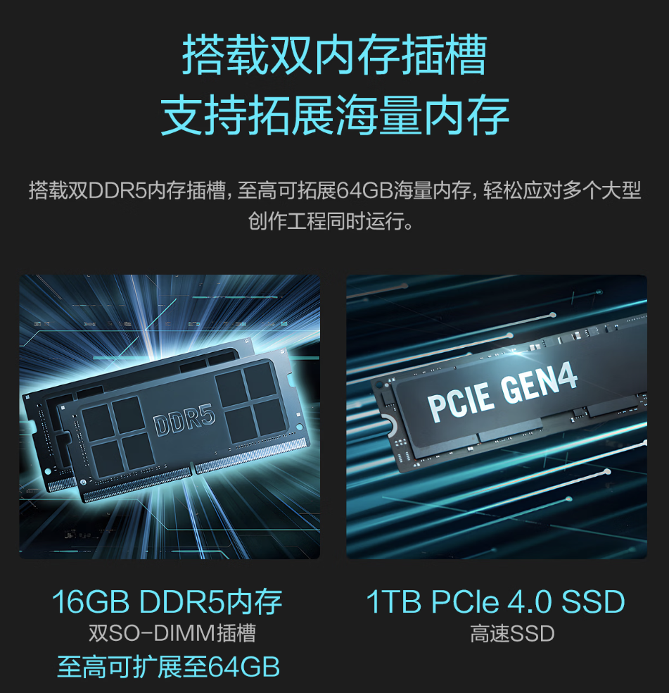 存储方面也让人踏实:16GB DDR5高速内存充足够用,剪辑视频多轨道叠加也不会闪退;若未来需处理更复杂的任务,其双插槽设计支持将内存升级至高64GB,有效避免因内存瓶颈而过早更换整机;1TB的PCle 4.0 SSD更省心,毫不担心应用打开、文件传输速度,存一整年的工作文档、会议录像都没问题,摆脱对移动硬盘的依赖。