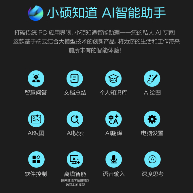 最意外的是“小硕知道”AI智能助手,功能十分实用,支持智慧问答、文档总结、AI 绘图、AI 翻译、离线智能等功能。开会资料太多,“小硕知道”直接帮你摘要统计,哪一天需要做什么一目了然;找不到上周存的文件,不用翻遍文件夹,它也能很快就定位到路径——这些细节有效节省了处理琐事的时间,让人更能专注于核心工作。