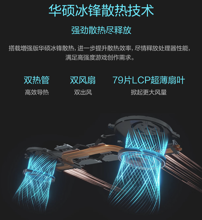 噪声?也完全不用担心!华硕冰锋散热技术,双热管双风扇高效冷静导热,更有安静、标准、高效和全速四档散热模式可选,确保机器在高负载下也能持续稳定运行,让您心无旁骛地沉浸于虚拟世界。