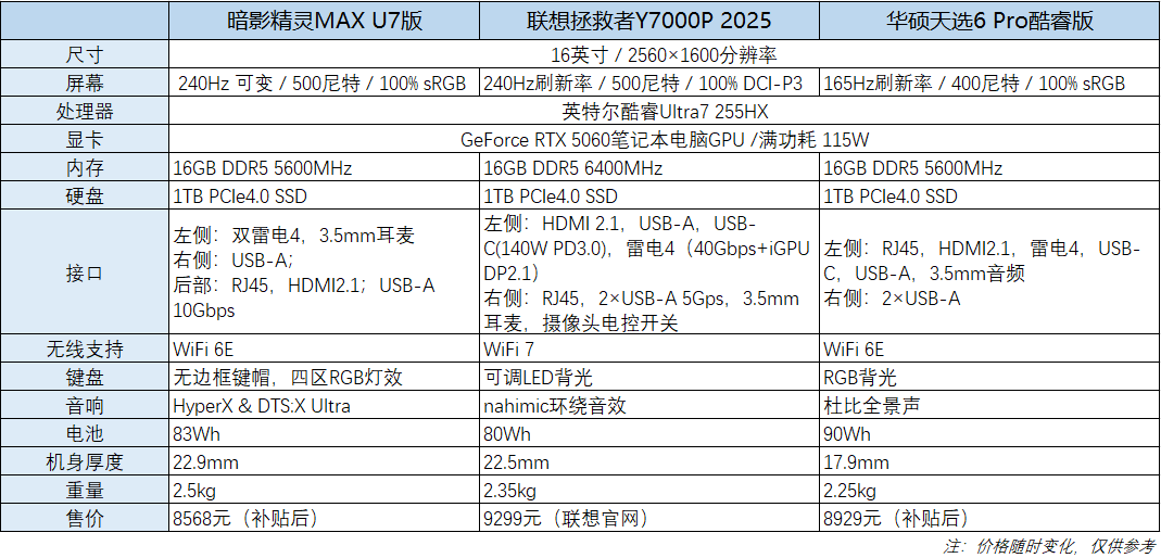 首先来看一下三款产品的各项参数,从基础配置看,三款笔记本站在同一起跑线上:均搭载酷睿Ultra 7 255HX处理器、RTX 5060显卡、1TB PCIe4.0 SSD,这种核心配置的高度一致,恰恰凸显了厂商在产品差异化上的巧思。