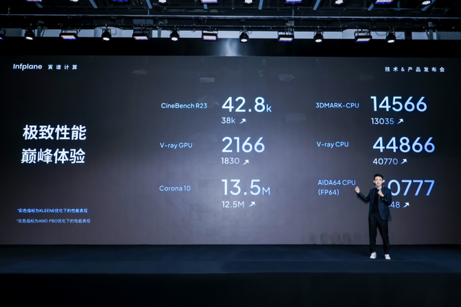 在发布会现场,Hilbert 以 KLEENE 主板智控系统生成的策略运行多项主流基准测试,展示了KLEENE系统级协同下的综合性能表现(测试结果受具体配置、软件版本与测试环境影响,数据仅供参考):CineBench R23 42.8k、3DMark-CPU 14566、V-Ray GPU 2166、V-Ray CPU 44866、Corona 10 13.5M、AIDA64 CPU(FP64)50777。寅谱计算表示,上述成绩旨在反映 Hilbert 在 CPU/GPU 计算、渲染与双精度等典型负载下的综合能力;相较于处理器芯片的纸面参数指标,KLEENE 更关注在真实工作流中对整机实际性能和功耗的实时优化,让“桌面级超算”的体验可被长期和可靠地使用。