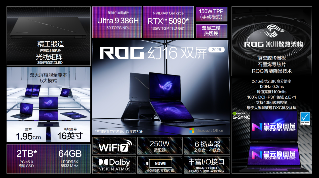 具备大屏专业创作属性的ROG幻16 Air 2026同样迎来全面升级。其搭载酷睿Ultra 9 386H处理器与至高RTX 5090 笔记本电脑GPU,并采用全新升级的冰川散热架构,使整机核心功耗释放提升到至高175W,性能更为强悍。同时机身依旧保持了约1.95kg重、1.49cm薄的出色便携性。屏幕上,其16英寸ROG星云原画屏具备2.5K分辨率、240Hz刷新率、0.2ms疾速响应等顶级参数,峰值亮度达1100nits,通过了VESA DisplayHDR True Black 1000认证,出厂校色支持色域切换,为专业工作流提供了更沉浸、更流畅、更高素质的视觉体验。