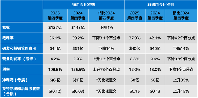 2026年1月23日,英特尔发布了第四季度以及全年财报,财报显示英特尔公司Q4营收137 亿美元,超出市场预期,非 GAAP 毛利率达 37.9%,盈利能力稳步提升。
