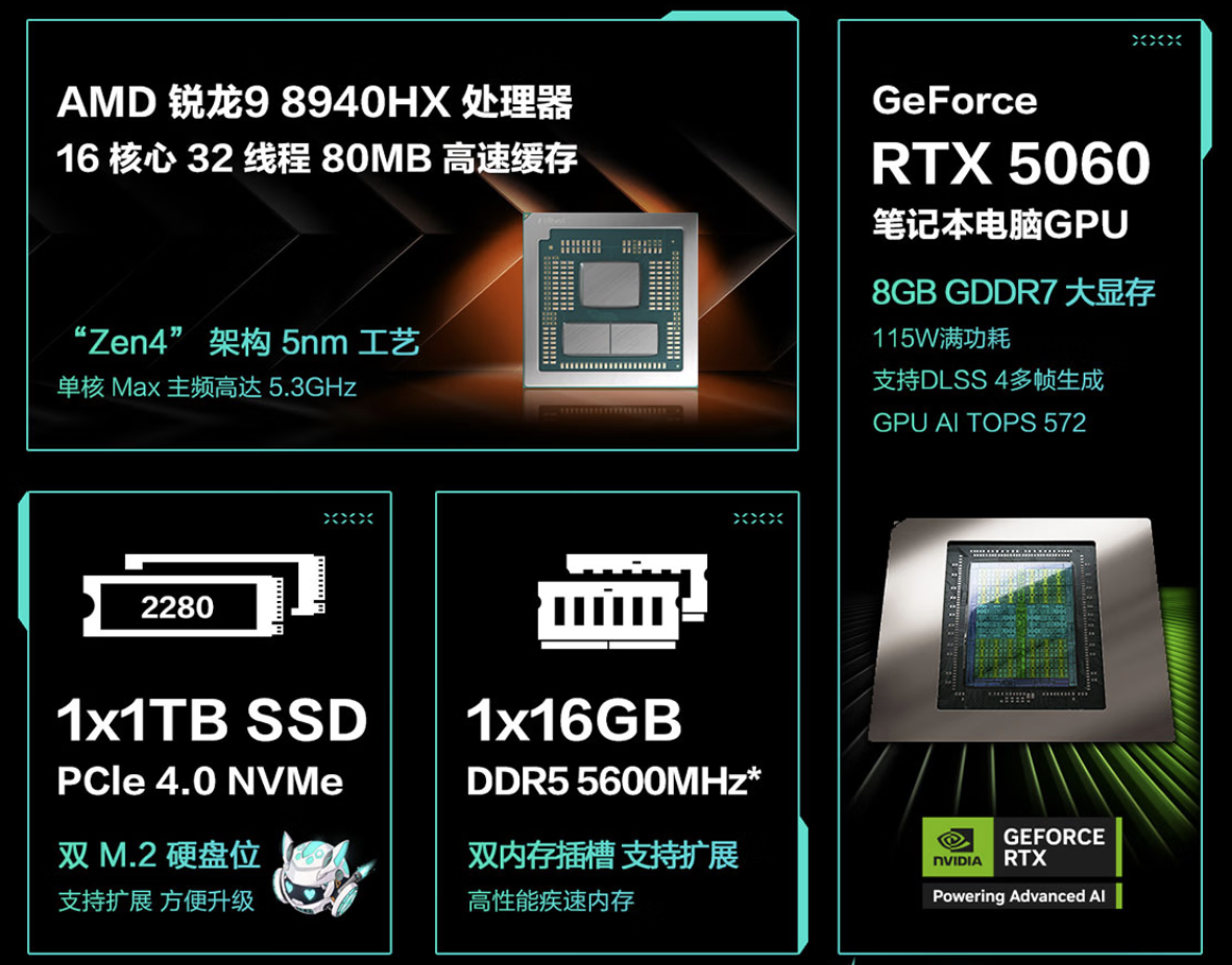 显卡方面配备 115W 满功耗 RTX 5060 笔记本电脑 GPU,支持全新 DLSS 4.5 多帧生成技术,GPU AI TOPS算力高达 572,游戏画质与帧率双重提升,畅玩 3A 大作毫无压力。