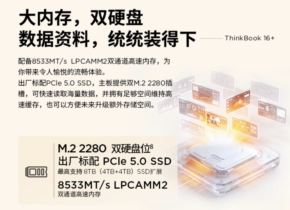 联想已在国内正式推出 ThinkBook 16+,标志着其面向主流笔记本 LPCAMM2 内存的普及正式启动。早在 2024 年,联想就已在 ThinkPad P1 Gen 7 上搭载这一全新内存标准。