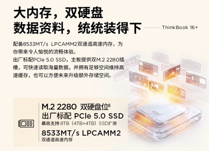 LPCAMM2 是新一代内存规格,兼具 LPDDR5X 的性能与传统 SODIMM 内存的可升级性。ThinkBook 16+ 是联想首款搭载 LPCAMM2 的消费级产品,最高配备 32GB LPDDR5X-8533 内存,搭配英特尔酷睿 Ultra X7 385H 处理器及 Arc B390 核显。