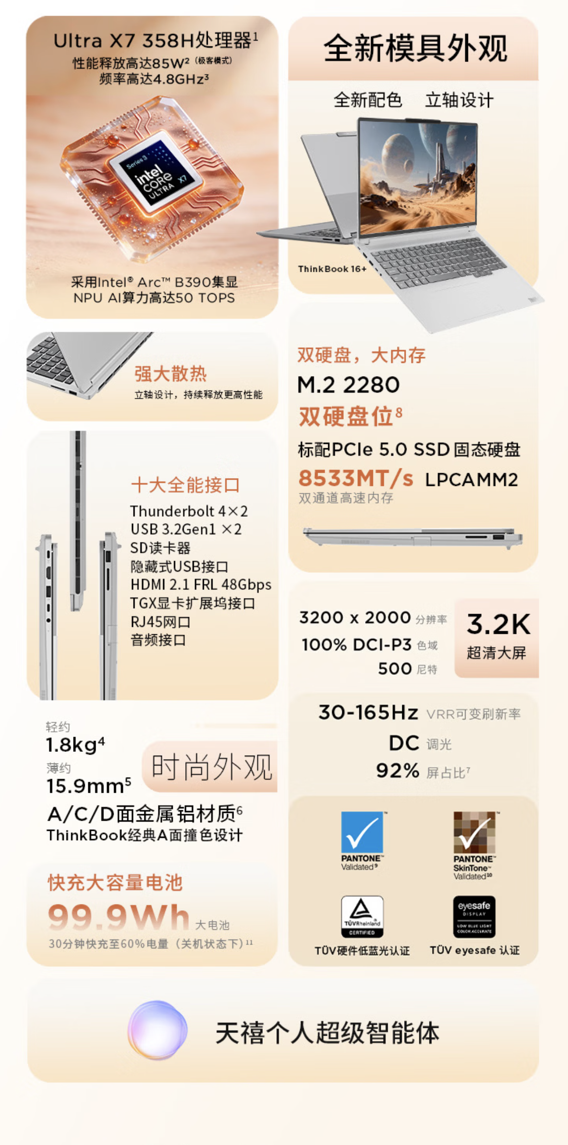 目前联想中国官网尚未完整公布 ThinkBook 14+ 规格,但 ThinkBook 16+ 配置十分亮眼: