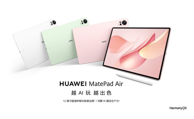 现在至2026年3月15日,华为商城,华为MatePad Air系列全系优惠300元,还可叠加15%国家补贴,大学生及教职工享受150元教育优惠,草木绿、樱语粉、羽砂白,多彩配色,潮流AI生产力,相当超值!
