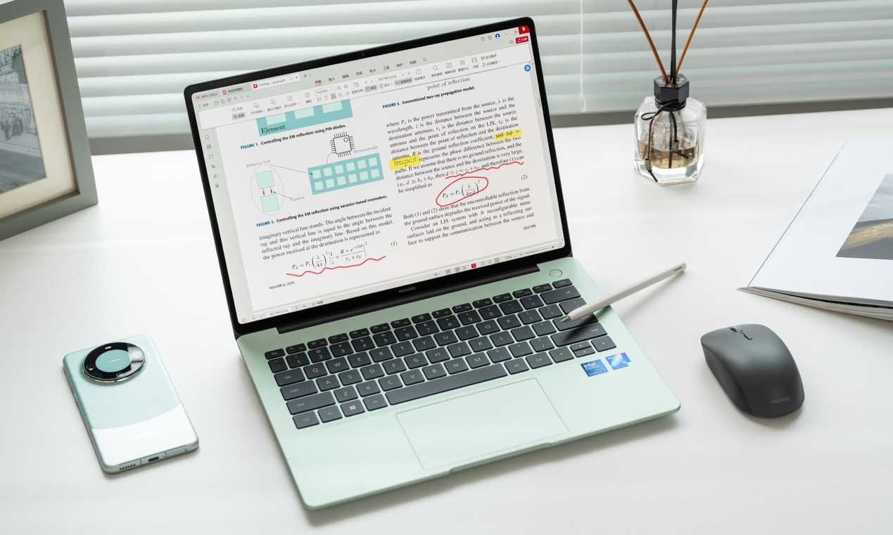 更重要的是,它支持高精度十点触控与手写笔(需配合HUAWEI M-Pencil套装),在阅读PDF、批注文档、课堂笔记等场景下,手写操作远比键鼠更直观、高效。设计上,轻至1.31kg、薄至14.5mm的机身,配上清新活力的“原野绿”新配色,极具辨识度。性能上,英特尔®酷睿™ Ultra高性能处理器的加持,足以从容应对各种专业软件和多任务挑战。
