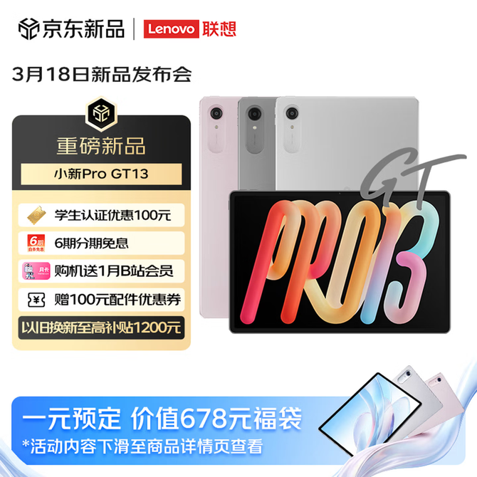 目前,联想小新Pro GT 13已在京东同步预约,京东独家首发权益全面开启,3月18日晚19点锁定发布会,见证AI与平板的完美融合,解锁全场景新体验。