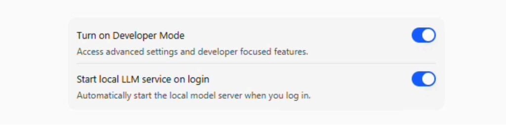 3、 勾选"Developer Mode(开发者模式)"和"Start LLM service login(登录时启动LLM服务)"。