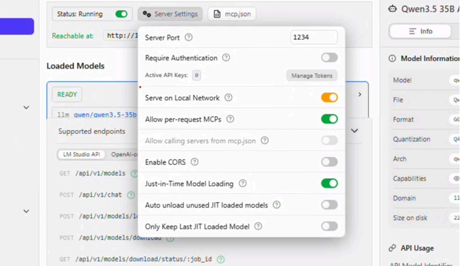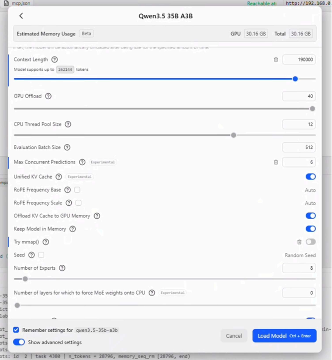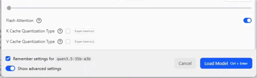 6、 点击Load Model(加载模型),选择Qwen 35B A3B。此前配置的设置应会自动填充,然后点击 “Load(加载)”。