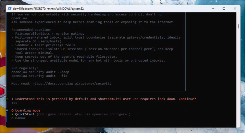 阅读安全警告后,按左箭头键切换至"是"选项,然后按回车键继续。再次按回车键选择“Quick Start(快速开始)"。