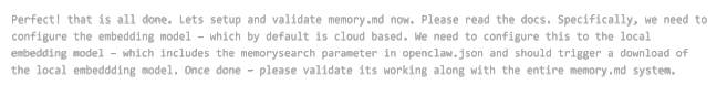 Perfect! that is all done. Lets setup and validate memory.md now. Please read the docs. Specifically, we need to configure the embedding model - which by default is cloud based. We need to configure this to the local embedding model - which includes the memorysearch parameter in openclaw.json and should trigger a download of the local embeddding model. Once done - please validate its working along with the entire memory.md system.