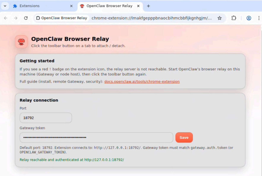 随后会出现一个页面,要求输入Token。请输入该Token 并点击 Save(保存)。如果配置成功,页面会显示 “Relay reachable and authenticated(中继已连接并完成认证)”。