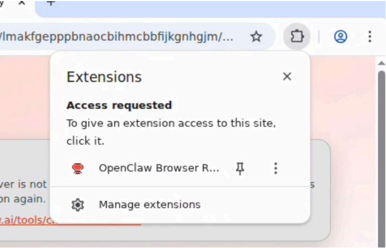 点击工具栏中的扩展程序图标(拼图形状),然后点击 OpenClaw Browser Relay 将其开启。开启后,您将看到提示信息:“OpenClaw Browser Relay started debugging this browser(OpenClaw Browser Relay 已开始调试该浏览器)。”