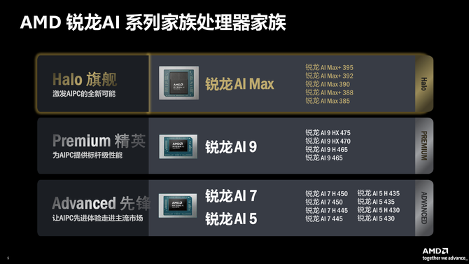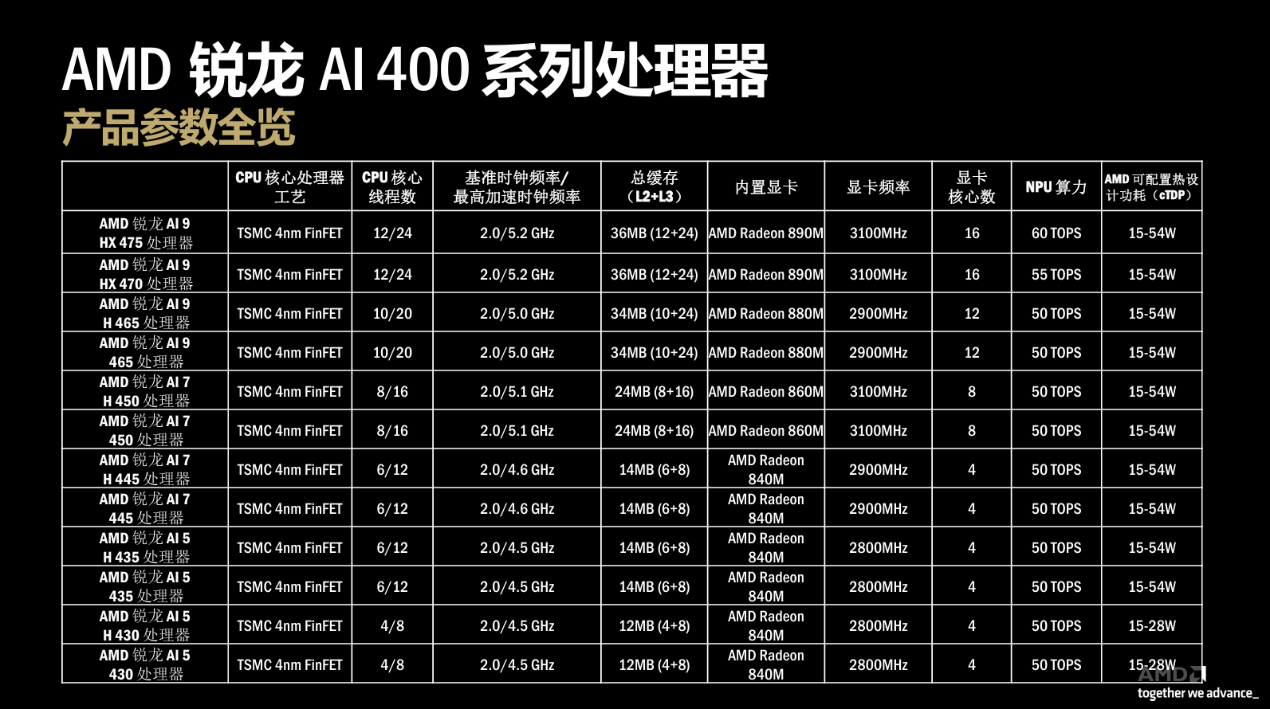 锐龙 AI 400 系列则聚焦消费级主流 AI PC 市场,构建起从锐龙 AI 9 到锐龙 AI 5 的完整产品梯队,以低功耗实现「性能与续航的平衡」。其中锐龙 AI 9 HX 475 拥有 12 核心 24 线程,NPU 算力达 60 TOPS,集成 Radeon 890M 显卡,兼顾移动生产力与轻量 AI 计算。全系列支持 24 小时视频播放与 20 小时网页浏览的超长续航,满足日常办公、学习的全场景需求。全系列集成 Radeon 800M 系列显卡,支持更高内存频率,在超薄本、迷你主机等便携形态中,实现了本地 AI 功能、生产力计算与娱乐体验的三重突破。