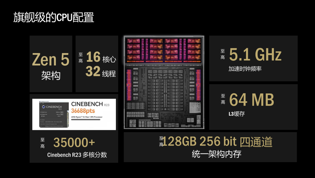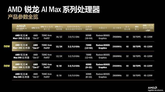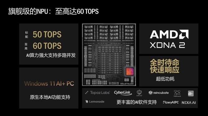 从技术架构来看,锐龙 AI Max 系列与 锐龙AI 400 系列共享 AMD 新一代计算架构核心,却针对不同场景实现精准化性能调校,形成「旗舰赋能专业场景、主流普惠大众体验」的产品格局。两大系列均采用台积电 4nm FinFET 工艺,基于 Zen 5 架构打造高性能 CPU 核心,同时搭载AMD XDNA 2 架构 NPU,其中锐龙 AI 400 系列 NPU 算力至高可达 60 TOPS,锐龙 AI Max+ 395 则标配 50 TOPS AI 算力,均远超 Windows 11 AI+ PC 的基础性能要求,为本地 AI 计算提供了充沛的算力支撑。