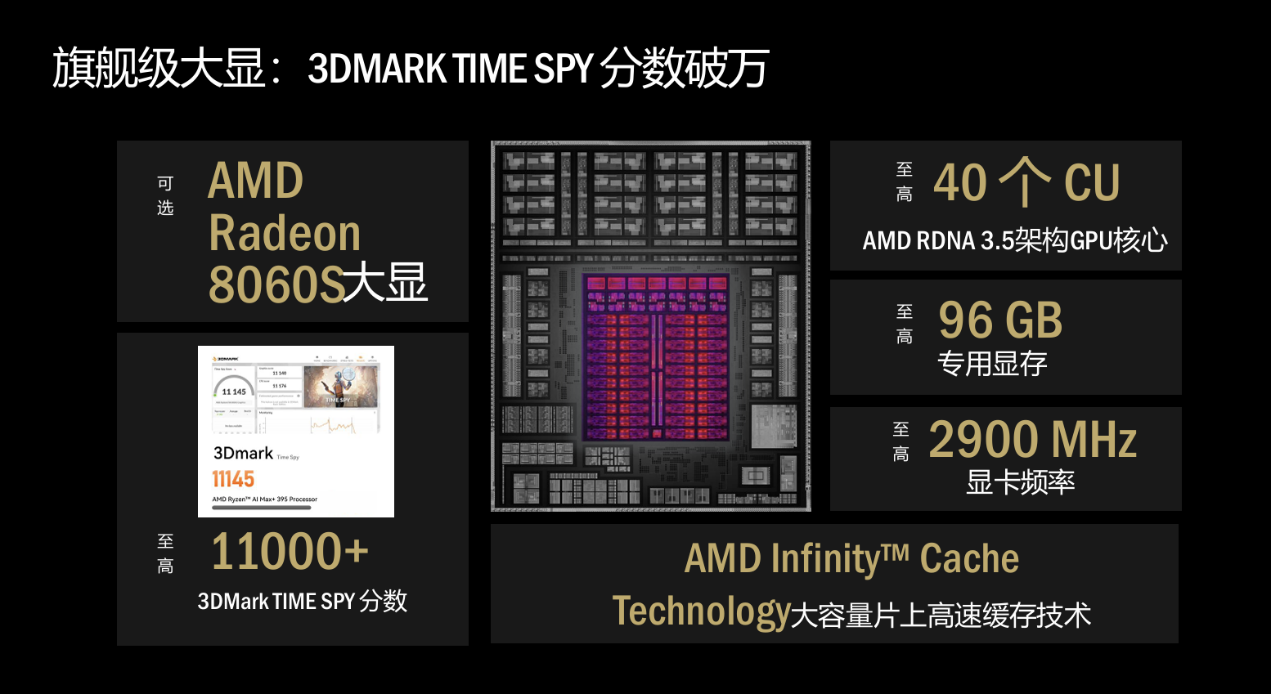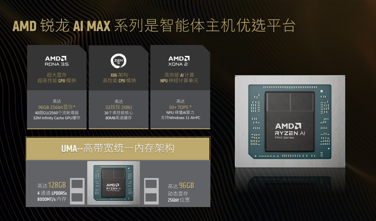 定位旗舰的锐龙 AI Max 系列堪称「端侧 AI 算力天花板」,其中顶配型号 Max+ 395 拥有 16 核心 32 线程的 CPU 配置,加速时钟频率至高 5.1GHz,搭配 80MB 超大缓存,CINEBENCH R23 多核分数突破 35000pts;集成 Radeon 8060S 显卡,拥有 40 组 CU 核心,并支持最高96GB 256bit 专用显存,3DMark TIME SPY 分数超 11000,兼具桌面级显卡性能与端侧 AI 推理能力。内存方面支持至高 128GB 4 通道 LPDDR5x 8000MT/s 统一内存架构,可轻松支撑 Qwen 3.5 122B 等大模型的本地部署,实现单智能体 50+tokens/s 的生成速度与多智能体并行处理,成为智能体主机的理想算力底座。该系列还拥有 45-120W 可配置热设计功耗,兼顾高性能与场景适配性,完美适配 Mini 工作站、高端创作本、游戏掌机等形态。