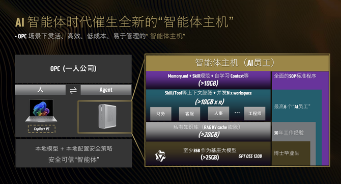 在硬件性能之外,两大系列的核心优势在于对「端侧 AI 生态」的深度赋能,让本地大模型运行、多智能体协同成为现实。锐龙 AI Max+ 395 凭借超大显存、高带宽统一内存与超强并行处理能力,可流畅运行 GPT-OSS-120B 等超大基座模型,支持 6 个以上 AI 智能体的并发工作,满足「一人公司」与专业团队的多任务处理需求;而锐龙 AI 400 系列则完美适配 Windows 11 AI+PC 原生功能,实现主动记忆、全屏内容识别、多语言实时字幕、图片超分辨率等系统级 AI 体验,让普通用户无需复杂操作,即可享受 AI 带来的效率提升。
