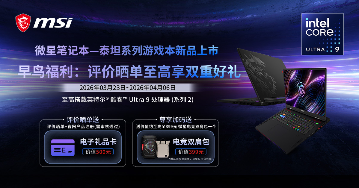 微星科技MSI——全球电竞、内容创作与商用笔记本电脑知名品牌,现已推出全新设计的泰坦系列高性能游戏本,并在各大电商平台陆续上市。首发抢购的龙骑士们,还可参与早鸟活动,享受双重好礼福利:至高价值500元电子礼品卡,价值399元电竞双肩包。