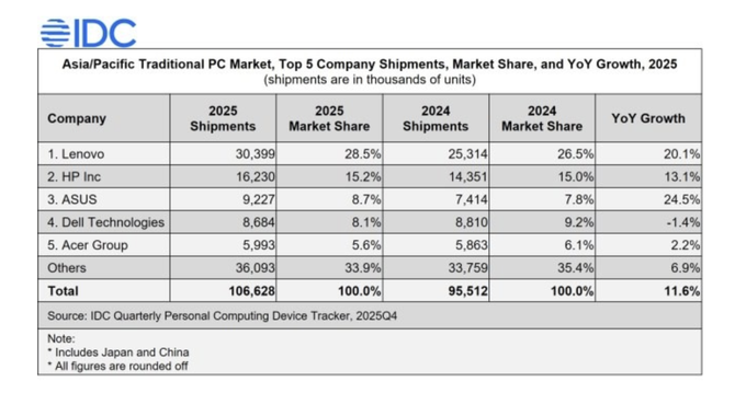 【IT168原创新闻】IDC最新发布的个人计算设备追踪报告显示,2025年亚太地区(含中国、日本)传统PC市场出货量达1.06628亿台,相较2024年实现11.6%的增长,首次突破1亿台大关。然而,受关键零部件短缺涨价和需求周期性的共同影响,预计2026年出货量将下降至约9200万台,同比下滑13.7%。