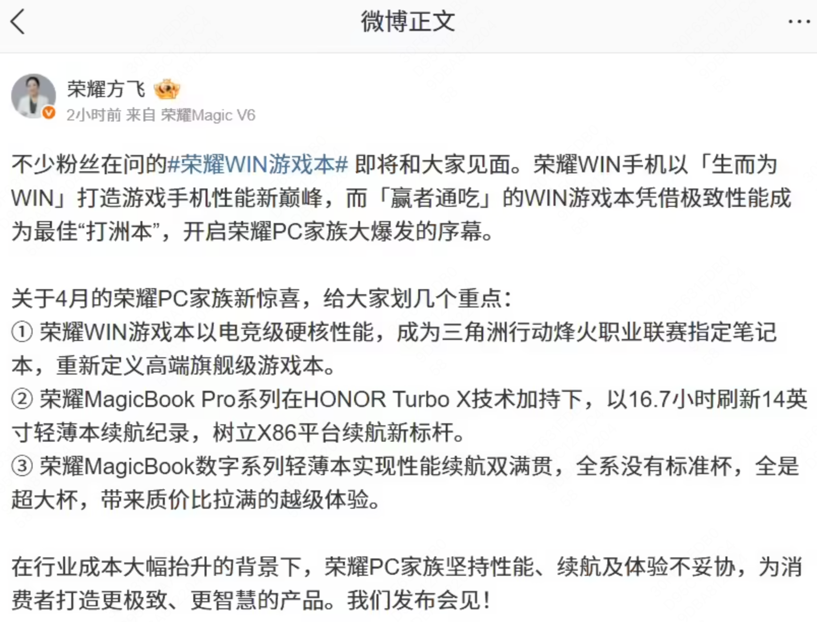 荣耀终端股份有限公司产品线总裁方飞今日正式宣布,荣耀WIN游戏本将于4月23日发布,并凭借极致性能成为《三角洲行动》烽火职业联赛的指定笔记本,重新定义高端旗舰级游戏本标准。