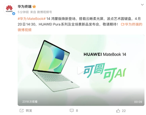4月中旬,华为终端官方微博发布众多新品预热短片。即将与华为 Pura90系列同步登场的,还有全新华为MateBook 14 鸿蒙版。预热短片以及官方账号信息透露了不少产品新特点。
