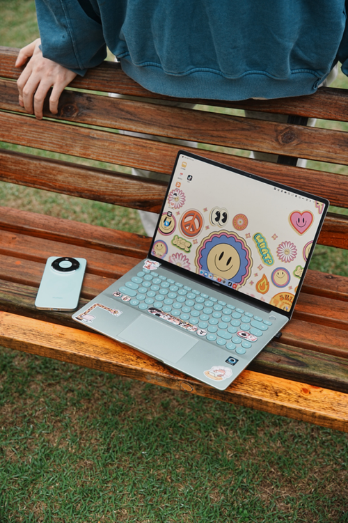 配色从前代偏商务的深空灰、皓日银等传统方案,拓展至多种活力色彩可选。在咖啡厅打开一台绿色的华为MateBook 14 鸿蒙版,搭配圆形键盘设计。使用姿态更加年轻,回头率不会低。