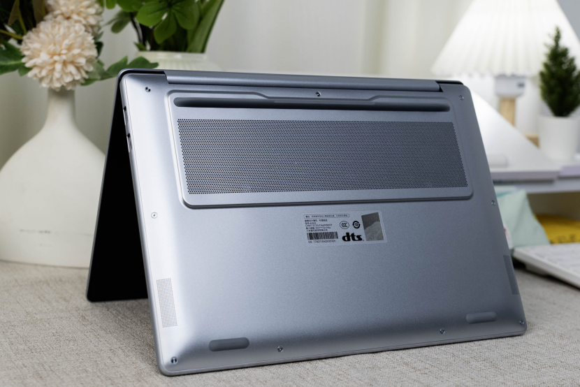散热表现方面,这款笔记本将出风口隐藏在了转轴的后部,并且巧妙地做了遮挡处理,在美观方面表现更好,让整个机身的一体性提升更加明显,风扇的底部则是散热的进气风道,并且底部的防滑脚垫也将机身明显地抬起,更进一步提升散热效果。