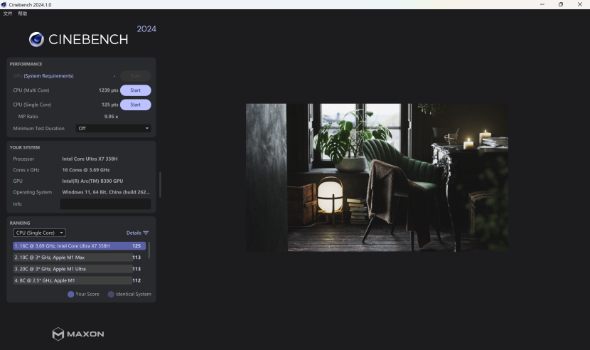 测试中我们在小米管家内开启电脑的性能模式,并且在电源管理的部分也采用了高性能模式,最终可以看到CINEBENCH 2024的多核心跑分为1239,单核心跑分为125,轻松超越苹果的M系列。