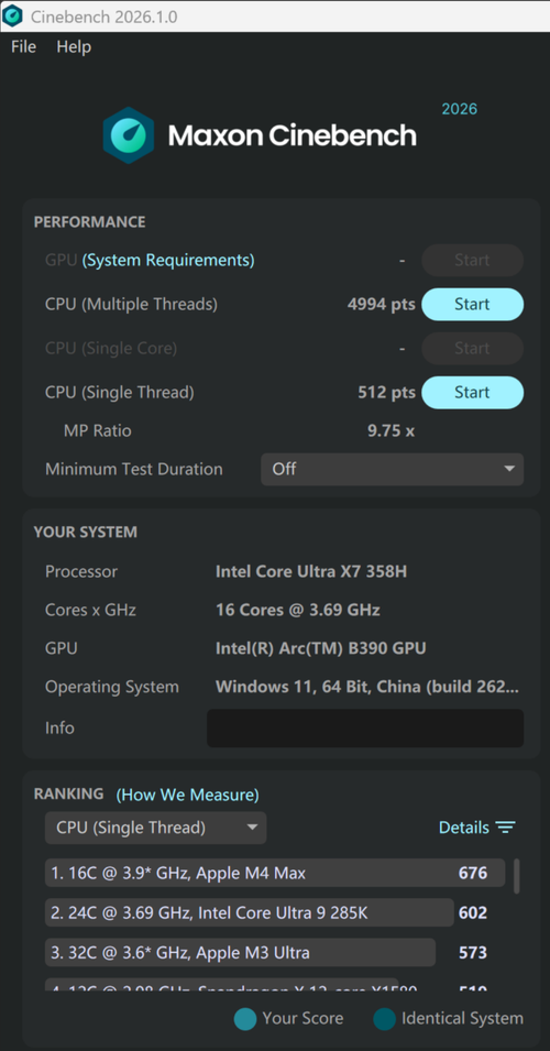 CINEBENCH 2026的测试项目里面,REDMI Book Pro 2026的多核心分数为4994,单核心分数为512。
