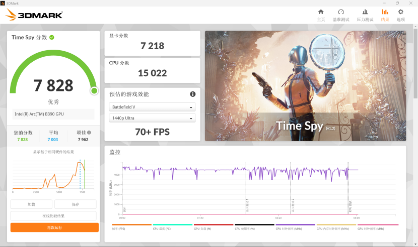 TimeSpy的测试中,我们看到显卡的分数同样来到了7218,CPU的分数则是15022,综合分数为7828,达到了优秀的水平,并且证明REDMI Book Pro 2026能够在2K分辨率轻松畅玩各类2K分辨率的游戏大作,综合性能表现出色。