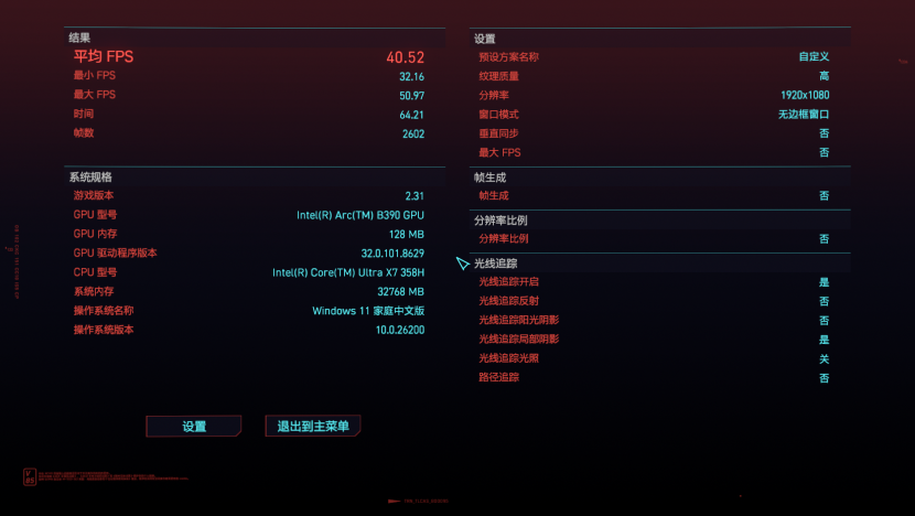 来到号称“硬件杀手”的赛博朋克2077进行测试,在默认的低特效的情况下,游戏的帧数为40.52FPS,这放在目前流畅标准为60的时代来看,显然是不够看的。