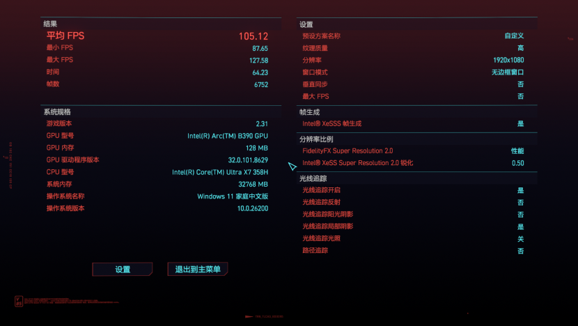 但是开启XeSS和帧生成之后,就能看到游戏的帧数来到了105.12FPS,游戏帧数提升2倍还多,这对于喜欢游戏的玩家来讲的话,REDMI Book Pro基本上能够本地通吃目前市面上所有的3A大作和网络游戏,轻薄本也能畅玩各类游戏。