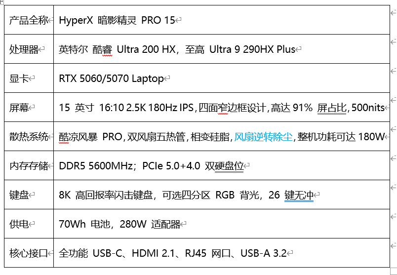 HyperX 暗影精灵 PRO 15在更紧凑的机身里,至高搭载Ultra 9 290HX Plus芯片,至高可配RTX 5070显卡,而且做到了180W+的整机功耗释放,自动风扇逆转除尘功能同样具备,长期使用的散热稳定性不用操心,网游3A都不在话下。2.5K 180Hz IPS屏幕、8K闪击键盘同样配备,0.125ms响应时间。SSD的双硬盘位设计,存储扩展性也有保障。