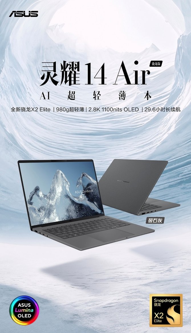 华硕灵耀14 Air骁龙版 & ProArt创X 2026:骁龙X2 Elite加持,轻薄办公与专业创作双赛道发力