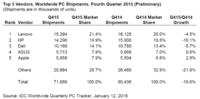 - 联想连续11季度问鼎PC市场冠军北京时间1月13日,全球市场调研机构IDC发布最新PC供货商榜单。截止到2015年第四季度,联想集团凭借1539.4万台的全球PC出货量,毫无悬念地连续11个季度夺得全球PC销量冠军。根据IDC的数据,2015年第四季度全球PC总出货量约7189万台。惠普全球市场份额为19.9%%,位列榜单第二。戴尔以14.1%%的市场份额紧随其后。华硕、苹果分列四、五位,市场份额均为7.9%%。其中第四季度苹果市场份额的上扬,受到其新款笔记本MacBook的带 冯伟 · 2016-01-14 18:38