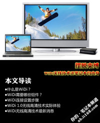 WiDi是英特尔无线显示技术(Intel Wireless Display)的缩写。通过这项技术,用户可以通过无线信号连接自己的笔记本电脑与大屏幕显示设备,如平板电视等,在更为宽大的屏幕上享受高清影音,而不需要HDMI连接线和屏幕小的困扰。
