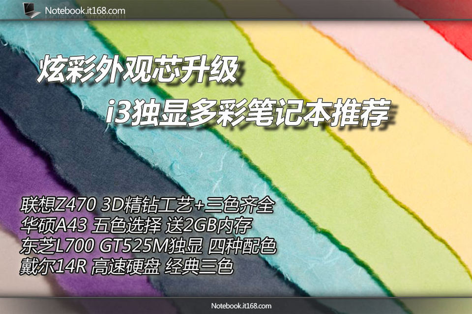 笔记本电脑展现给大家的整体形象,目前还很难突破这种一开一合的样子,所以很多厂商会在产品设计时,对包括颜色、材质等在内的外观特别花费心思。因此,近两年,我们不光看到了越来越多的产品采用金属,罩面漆等新材质之外,笔记本电脑外观的多彩化,也在成为一种流行趋势。今天,笔者为大家带来四款都具备多种颜色外观的笔记本电脑,同时,它们还都采用酷睿i3处理器,而且有三款都使用了升级版i3 2330M处理器,搭配独立显卡,性能绝对够满足日常家用。