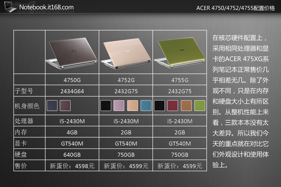 在4500元价位的宏碁ACER 4750G/4752G/4755G笔记本,在核芯硬件上为我们提供了i5-2430M处理器和GT540M显卡的搭配,具有较高的性价比,适合学生用户购买,不过三款机型虽然高度相似,但还有各有特点。
