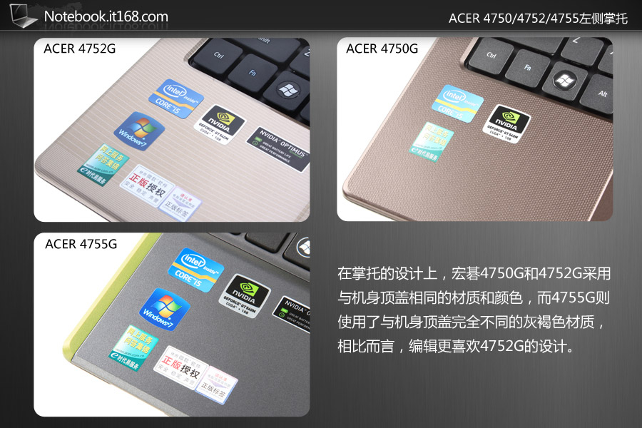 在掌托的设计上,宏碁4750G和4752G采用与机身顶盖相同的材质和颜色,而4755G则使用了与机身顶盖完全不同的灰褐色材质,相比而言,编辑更喜欢4752G的设计。