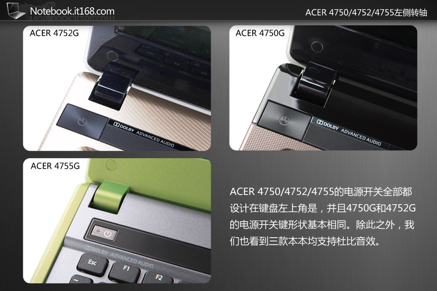 ACER 4750/4752/4755的电源开关全部都设计在键盘左上角是,并且4750G和4752G的电源开关键形状基本相同。除此之外,我们也看到三款本本均支持杜比音效。